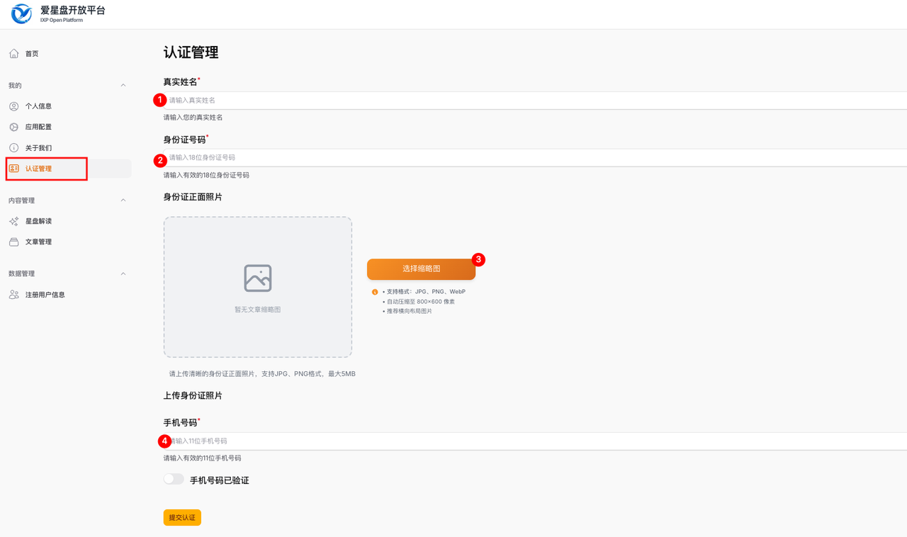点击左侧“认证管理”,按数字顺序填写上传相应的资料,最后点击“提交认证”即可完成实名认证。上传后,需要一定时间由人工进行审核,一般不超过24小时。