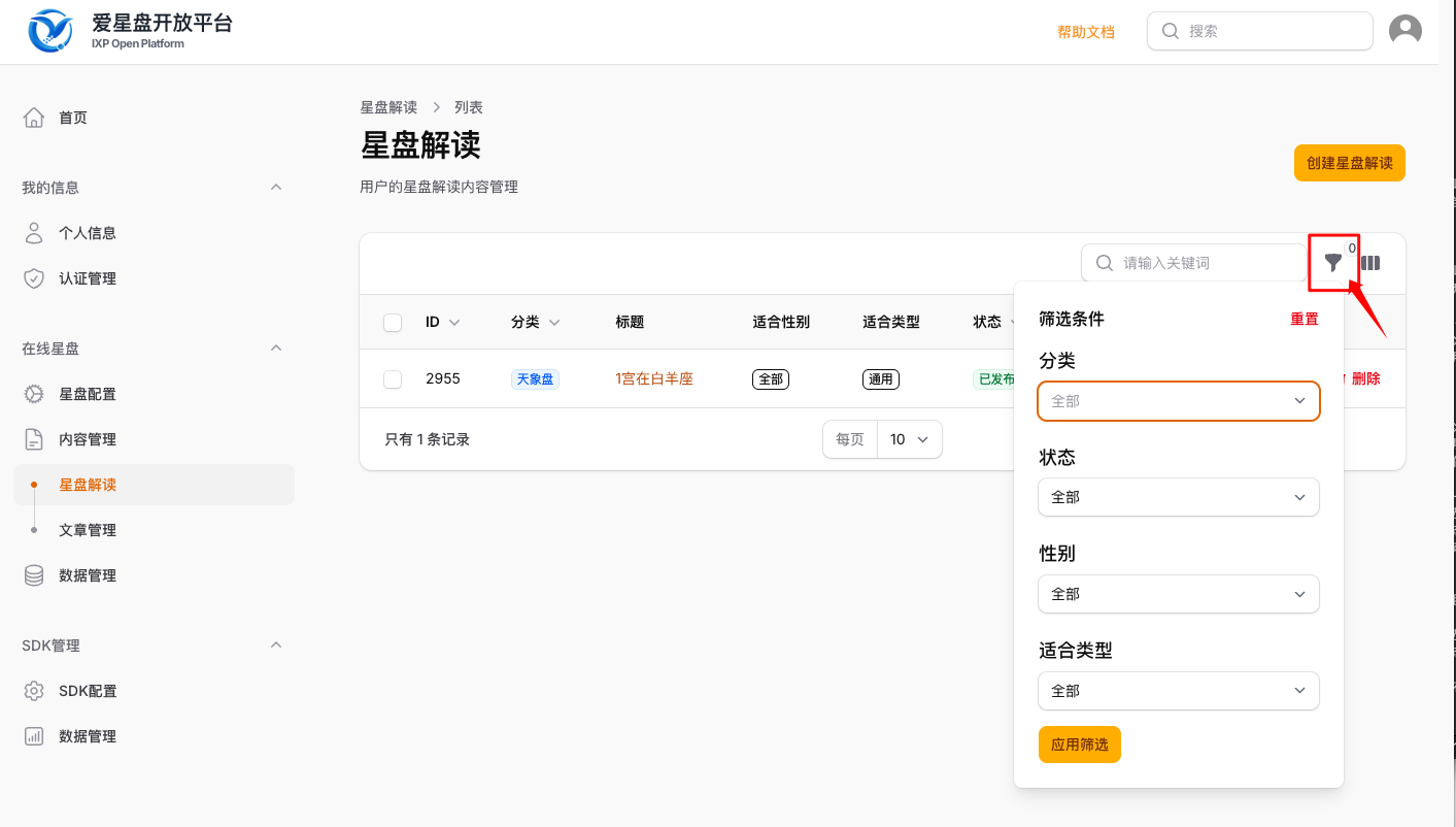管理小贴士:在解读列表页的右上角,可以使用【筛选】功能,快速查找和管理不同状态或类型的解读。