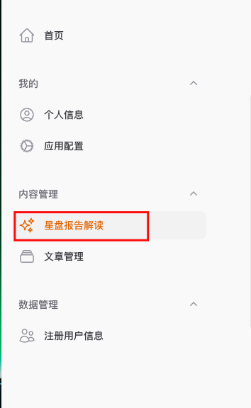 那么现在我们试着开始创建一条解读报告 在左侧菜单栏点击“星盘报告解读”,然后选择右上角“创建星盘报告解读”,即可进入编辑页面。接下来按以下步骤操作即可: