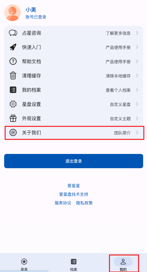 具体会在在线星盘“我的”页面中的“关于我们”中展示