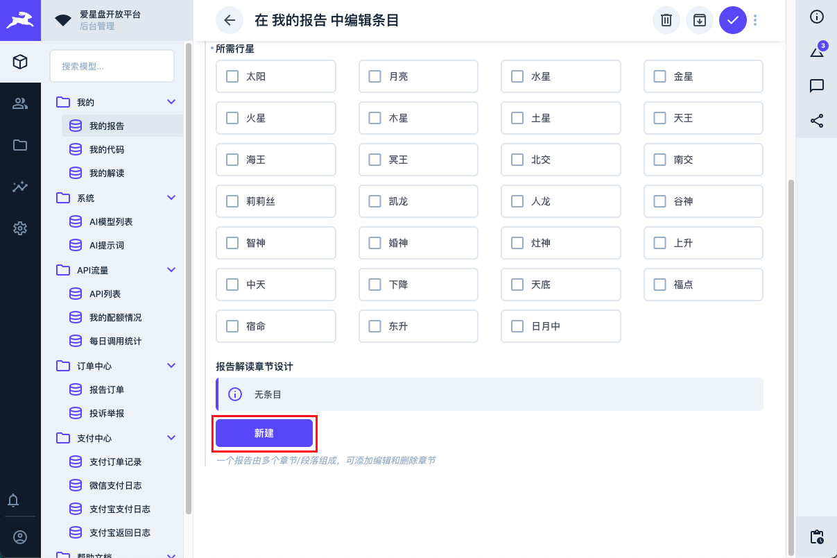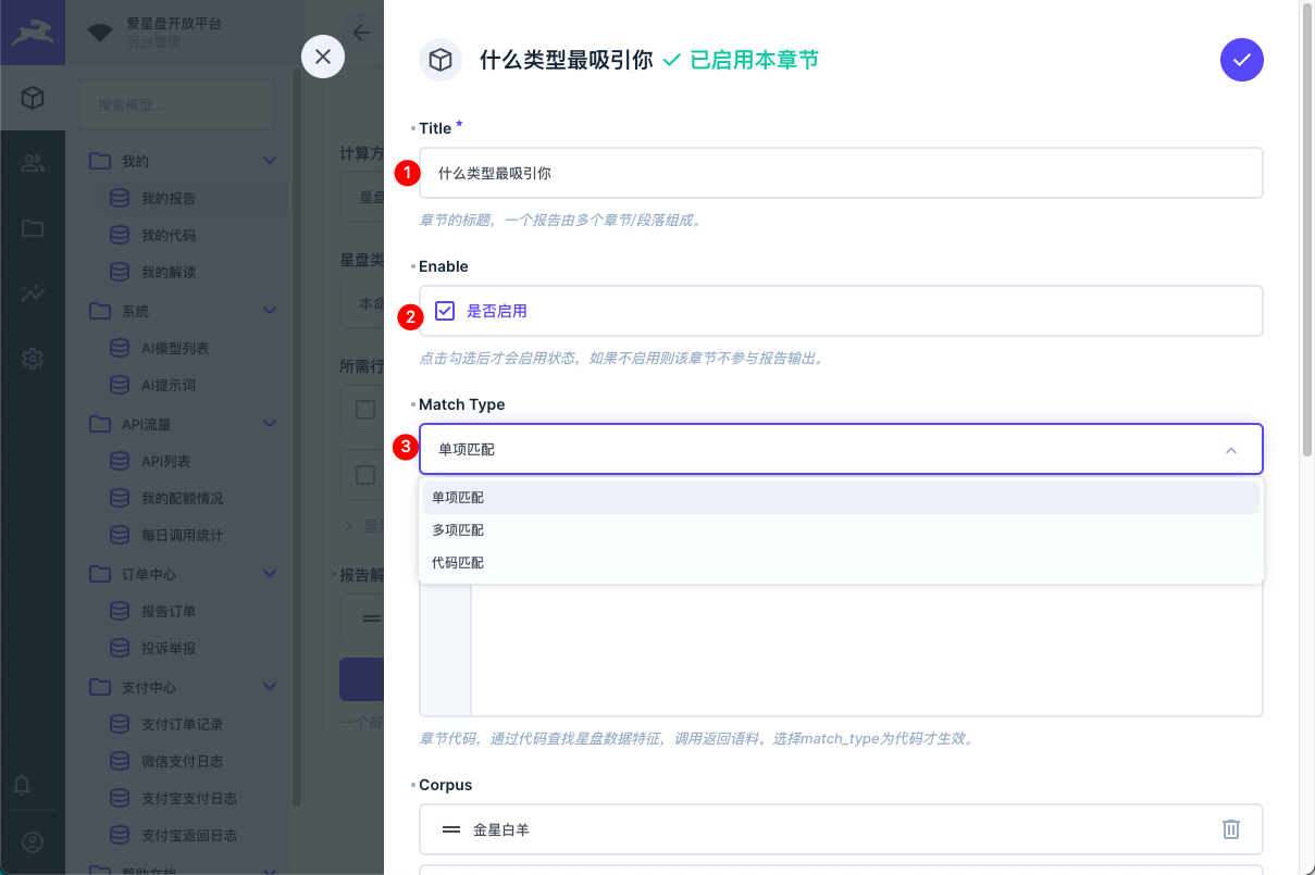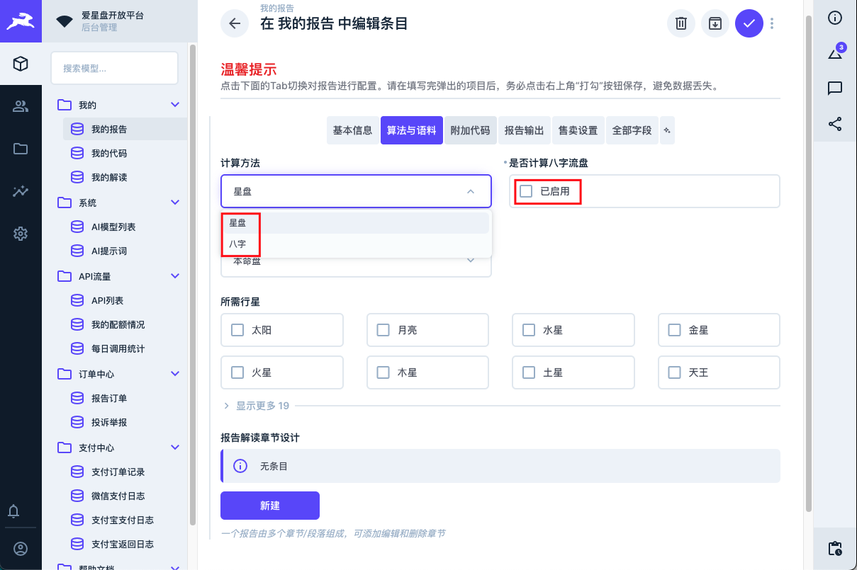 算法与语料编辑部分是报告创作的核心,在此环节,您需要将占星或八字专业知识转化为系统可执行的逻辑,具体流程包括选择计算方式、编写解读章节、设置判断条件与匹配模式等。