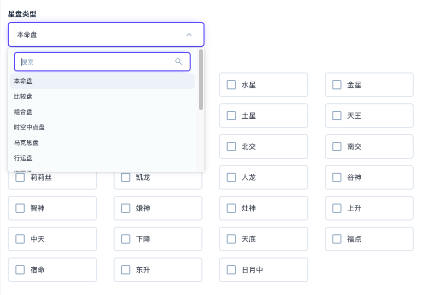 需选择具体的星盘类型和计算中需要使用的行星。如果无此操作,会导致编写算法但无法匹配的情况。
