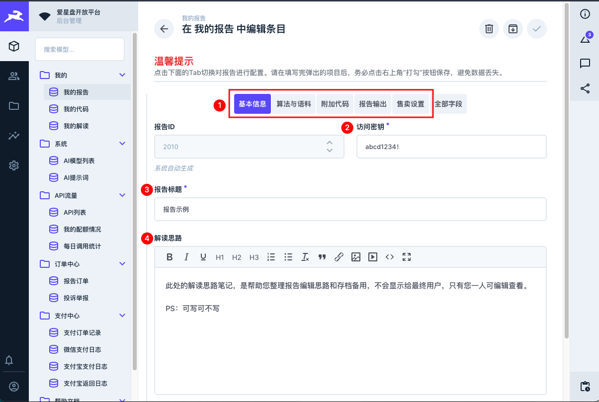 3.在报告编辑页,您需要完成以下几个基础设置: